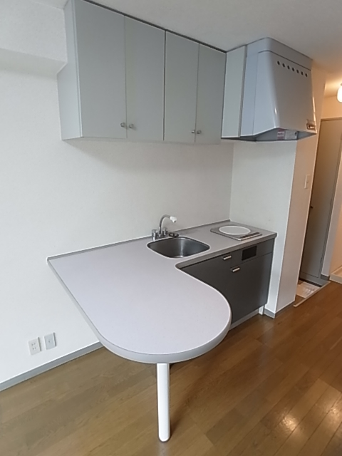 キッチンはなかなか個性的です!お部屋にポツンとあるので、カウンターキッチンのような、お店みたいな..お部屋を見ながら作れるキッチンです。換気扇もなかなかハイセンスですね。